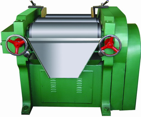 三輥研磨機是通過水平方向排列的三根輥筒不等速旋轉相互擠壓,使得相鄰軋輥產生強烈剪切力,從而磨擦、剪切,完成對漿料的研磨。